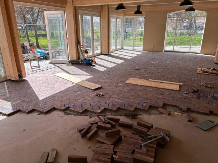 Voor de vloeren kwamen ze uit bij gebruikte stenen in lingeformaat. Steenzagerij T.T.A. werd gevraagd om de stenen die binnen werden gelegd, te zagen, zodat ze een mooie eenheid vormen met de bestrating buiten waarvoor dezelfde steen gebruikt wordt.